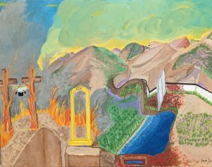 This painting represents my past, current and future in my journey as a survivor of Sexual Assault. I was sexually assaulted in a medical setting. After my assault I became very upset with God. I felt isolated and scared. However, about 4 or 5 months after my assault I found a church named Christ’s Church of the Valley (CCV). I started in a Women’s Trauma Group and attending CCV’s Sunday services. Through them I built my connection with God again. A couple months later the man who assaulted me committed suicide. His suicide has had a stain of confusion on my healing journey. However, through the tears and continually working through my fears I have found joy and beauty in my life. My healing is not linear and I don’t expect that to change. However, I believe I survived for a reason and I want that reason to bring about a positive future.